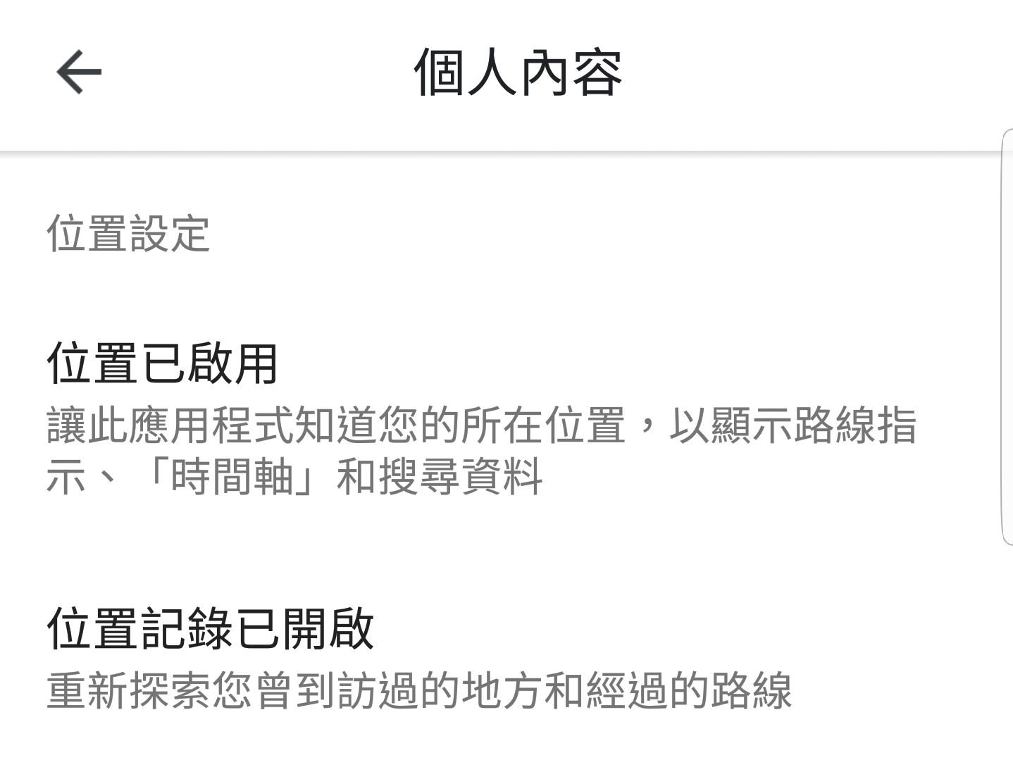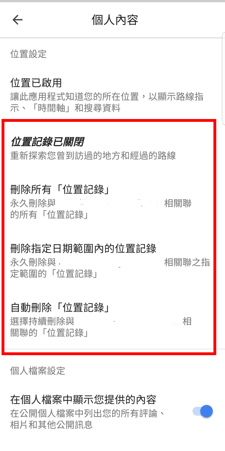 四.進入「個人內容」版面後往下拉,在「位置設定」中設定位置記錄相關設置;