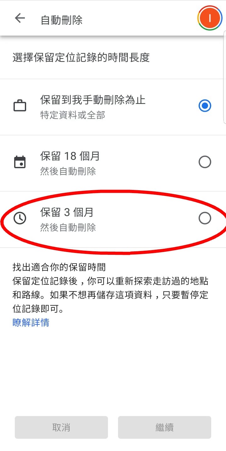 如果你想保留行蹤記錄一段時間,如保留3個月,按了之後,Google Map便會保留你的行蹤資料3個月,那便不怕被翻查3個月前的記錄了!