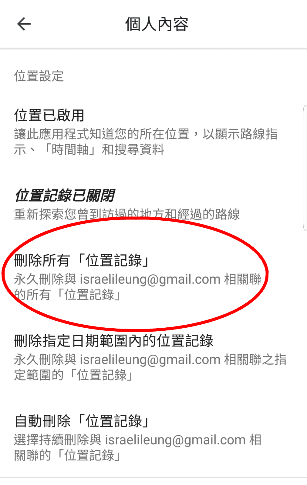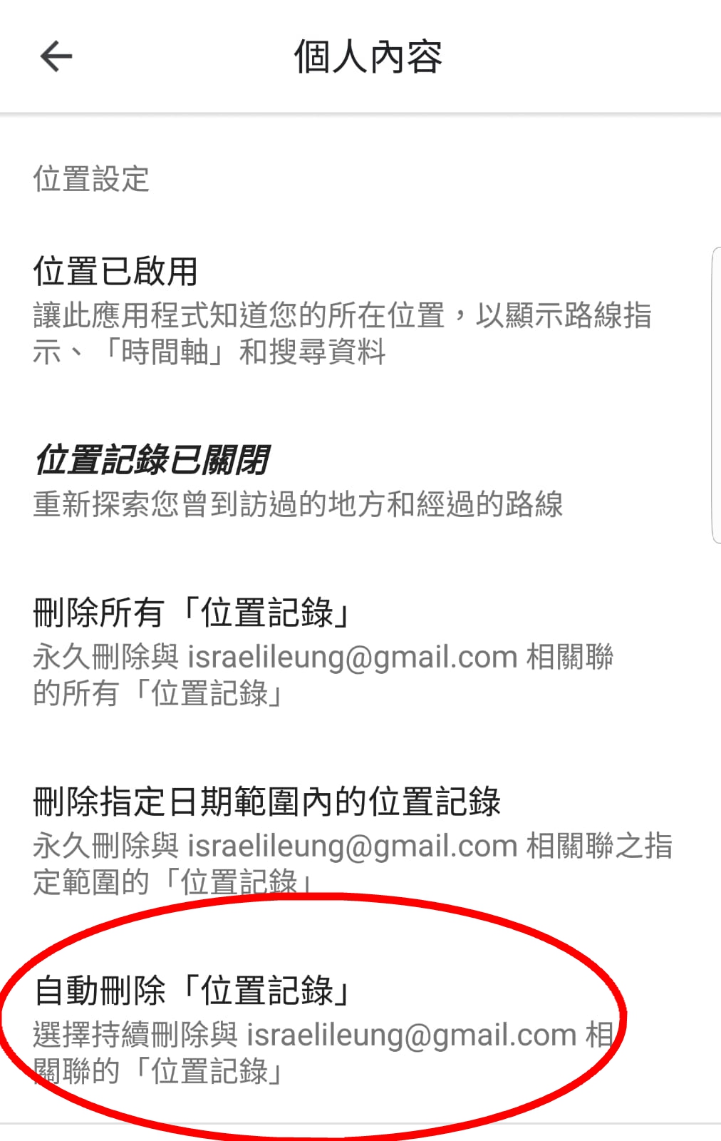 六.下一步,想自動刪除過往記錄的,請按照第四部,找到並開啟刪除「位置記錄」,接著便會出現以下選項。