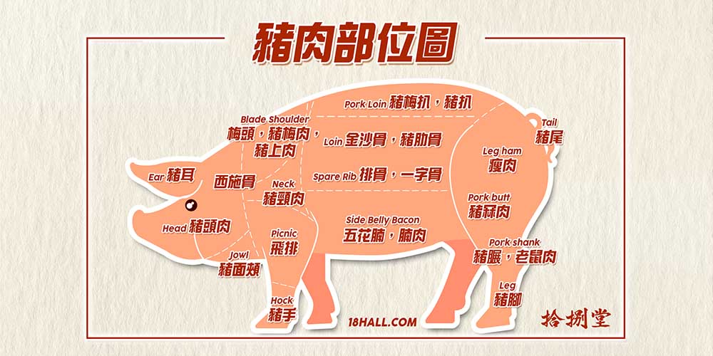 豬肉部位 有很多,豬肉部位香港叫法很有趣,因為就算是同一個豬部位,都可能有不同的香港豬部位叫法,最常吃的豬肉部位如 排骨,這款豬肉部位香港叫法就有一字排、豬肋骨及金沙骨等。你當然想知猪肉各部位的名稱及豬肉部位位置?即看下圖清楚了解豬肉部位圖,看看你想認識的豬部位在那個豬肉位置吧!